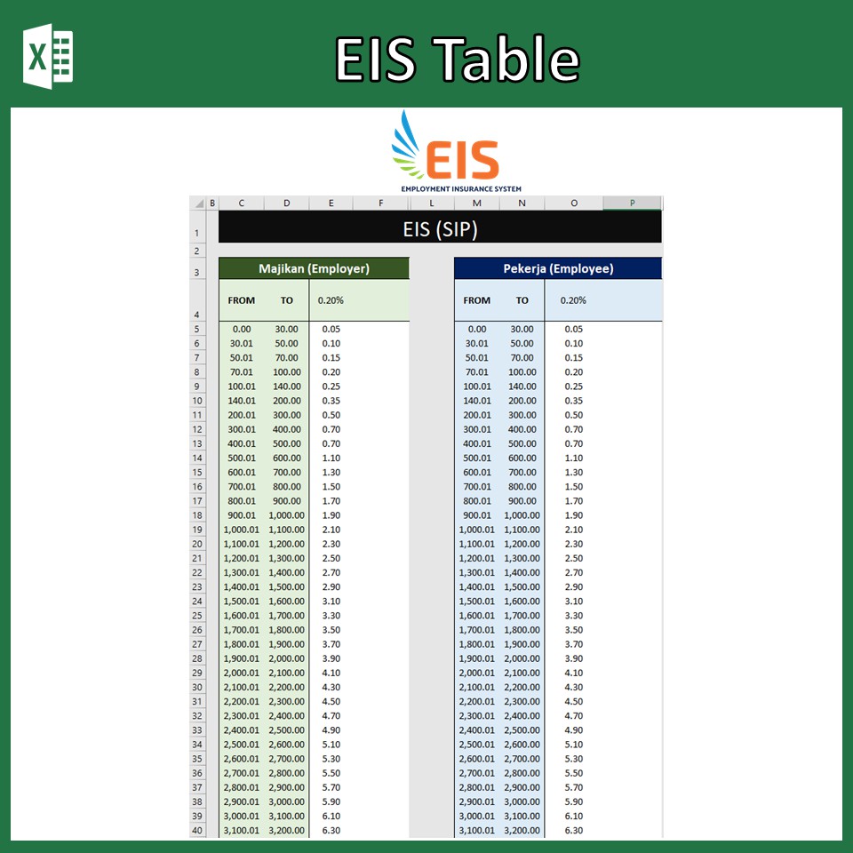 Untuk kadar caruman melalui sistem insurans pekerjaan sip atau eis juga perlu dibayar yang mana ia ditentukan kepada peratusan yang perlu .